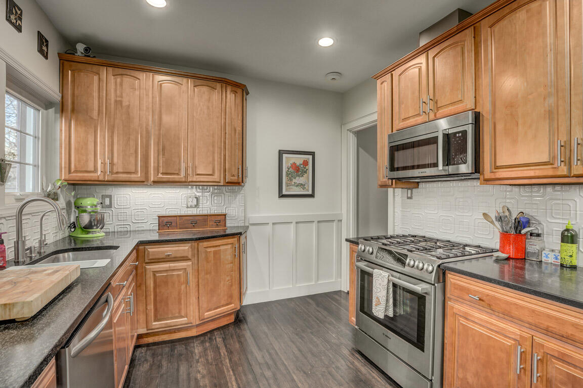 Inside, you'll find hardwood floors, gorgeous built-ins throughout, and a spacious living room anchored by a large gas fireplace, creating a cozy yet elegant atmosphere. The updated kitchen features a gas stove, ample cabinetry, and flows seamlessly into the main living spaces--perfect for both everyday living and hosting.