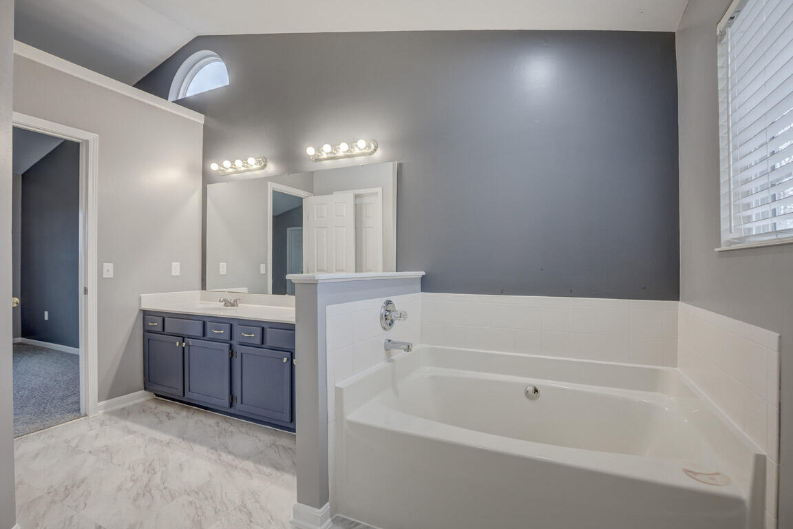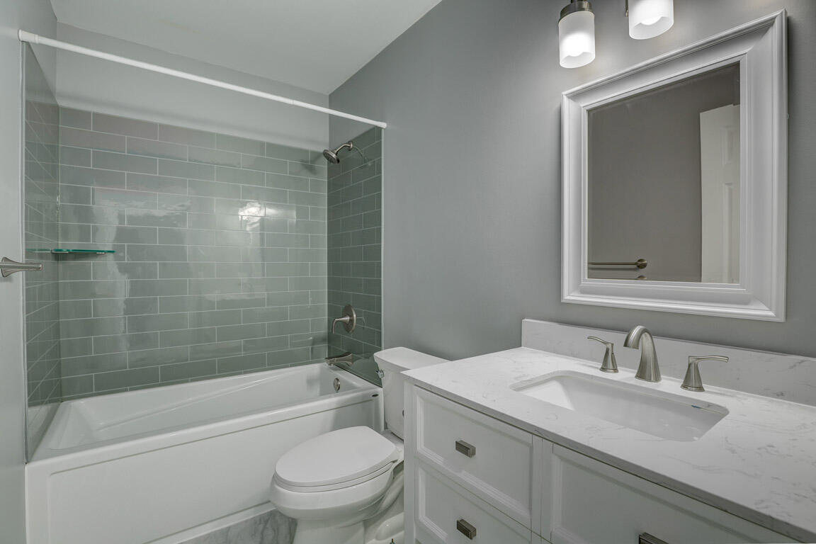 Head on up to the second level where you will find the spacious primary suite featuring cathedral ceilings, double vanities, a walk-in shower, and a relaxing soaking tub. Two additional bedrooms offer large closets and share the beautifully remodeled second full bath with ceramic tile surround, gorgeous new tub, quartz countertops, new vanity, and toilet.