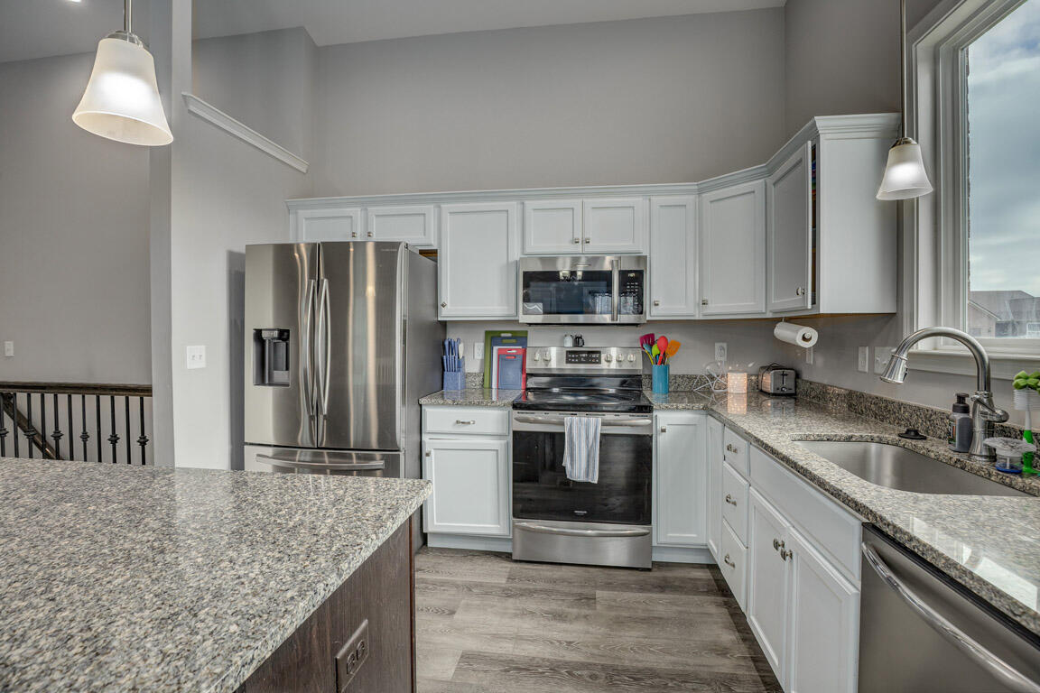 The open-concept main level features a spacious family room with soaring ceilings and a well-appointed kitchen complete with stainless appliances, granite countertops, counter seating, and abundant cabinetry--seamlessly flowing into the dining area for easy everyday living and entertaining.