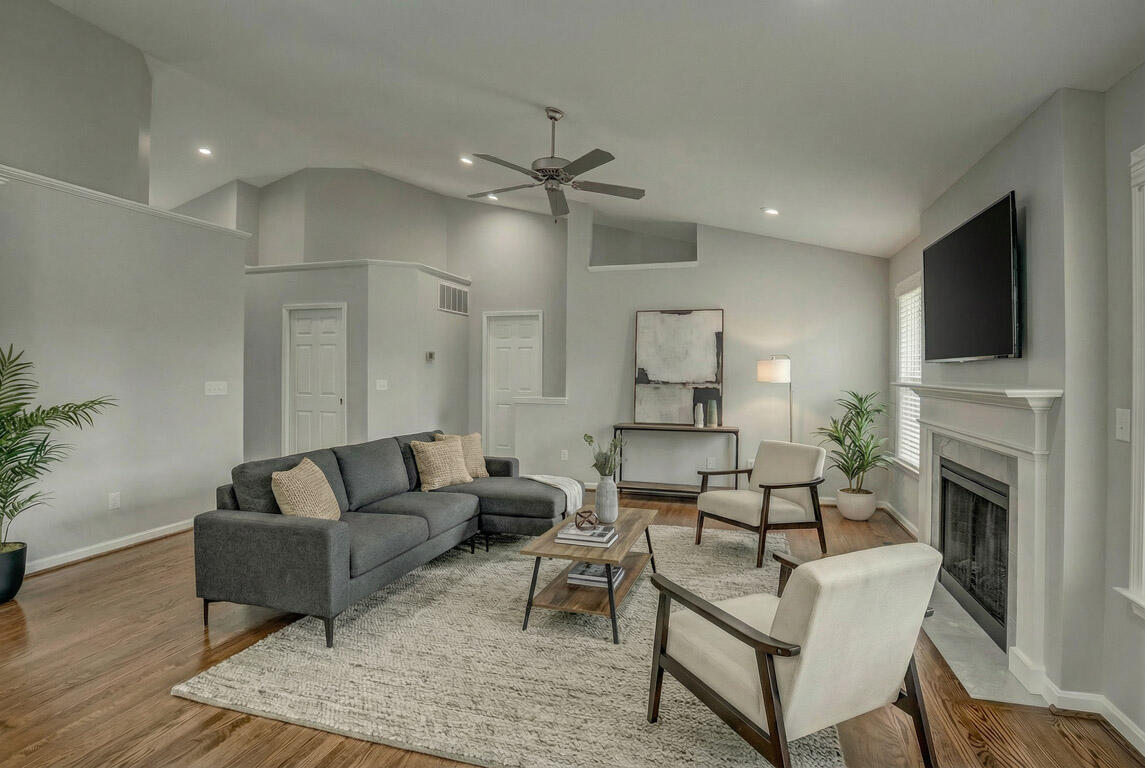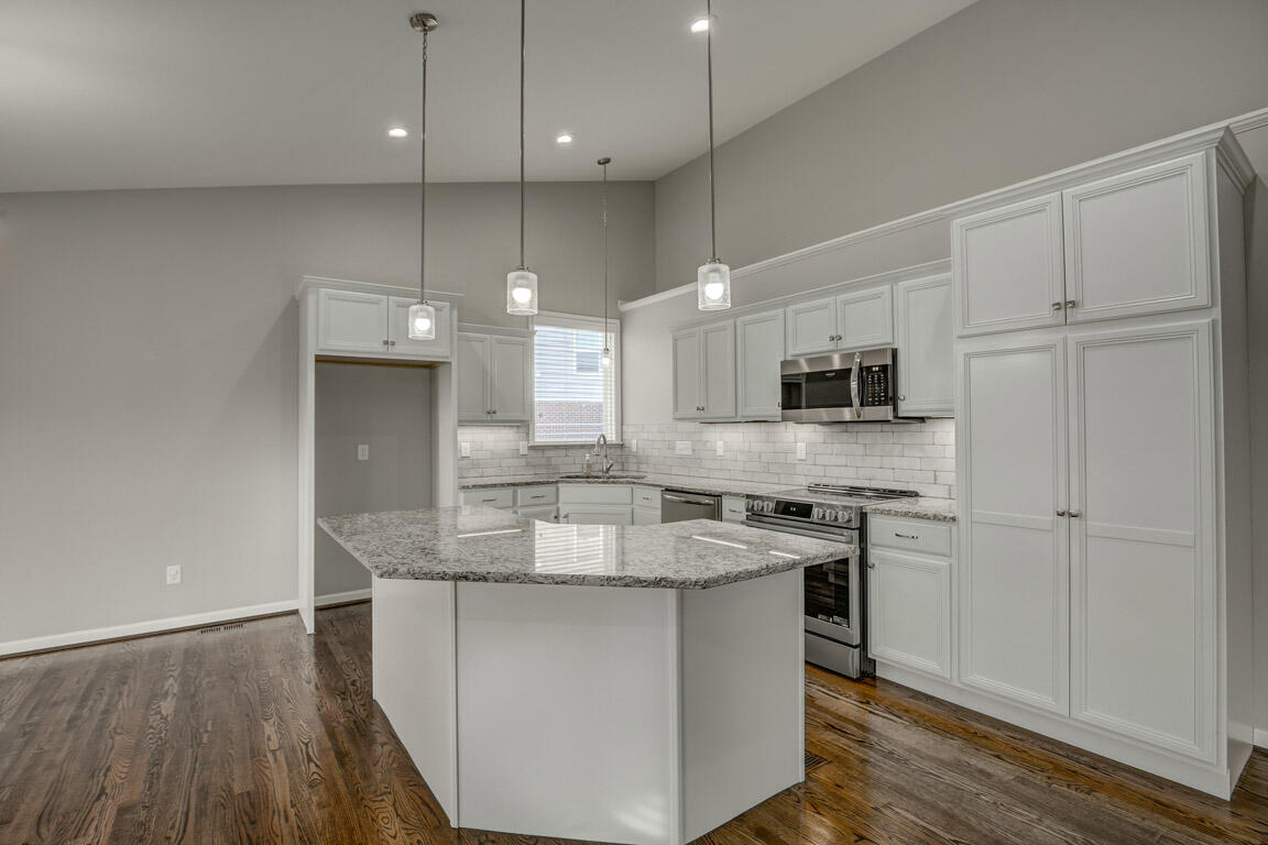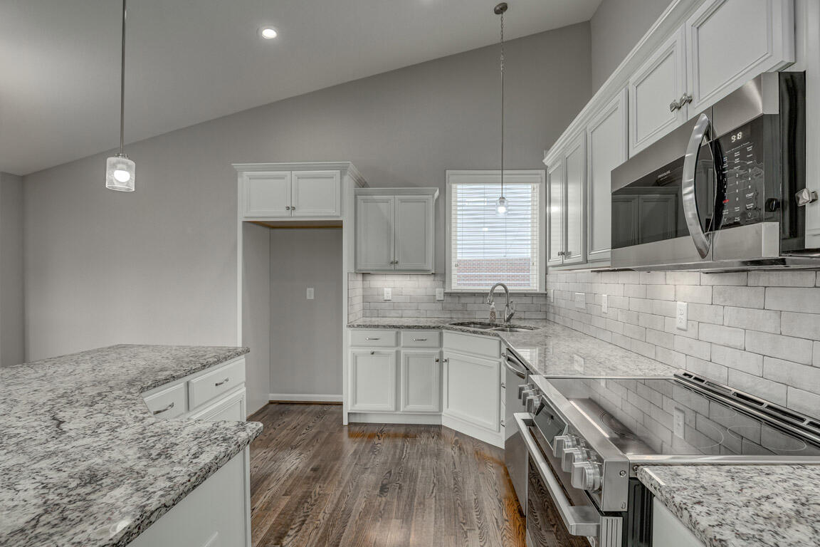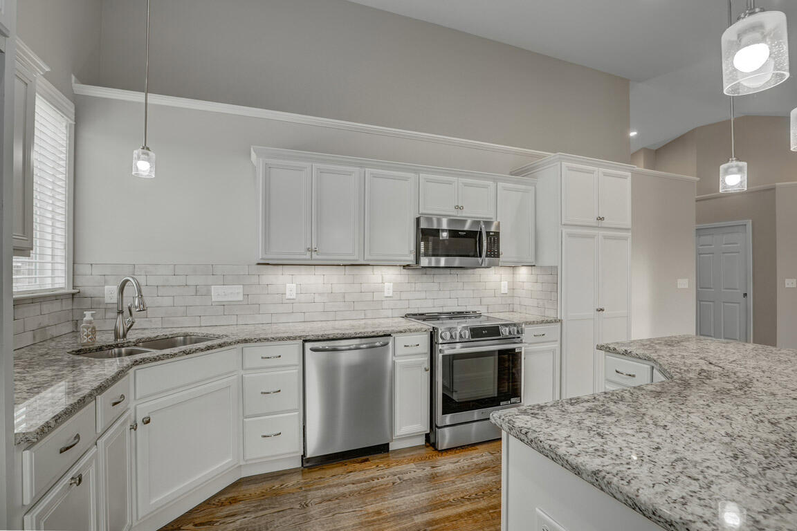 The stunning kitchen shines with granite countertops, an undermount double bowl sink, new faucet, fabulous convection air fryer oven, and a unique custom backsplash that elevates the space. A large island with white cabinetry and crown molding anchors the kitchen and opens to the dramatic living area centered by a beautiful fireplace and soaring cathedral ceilings.