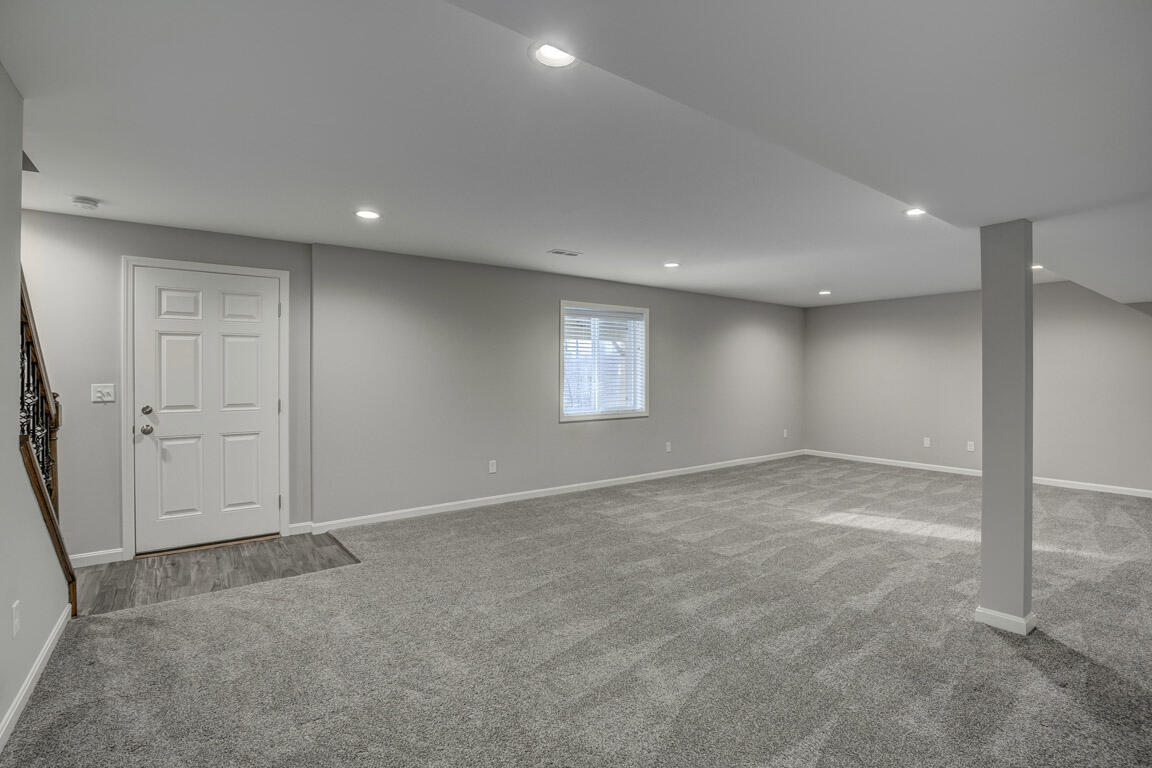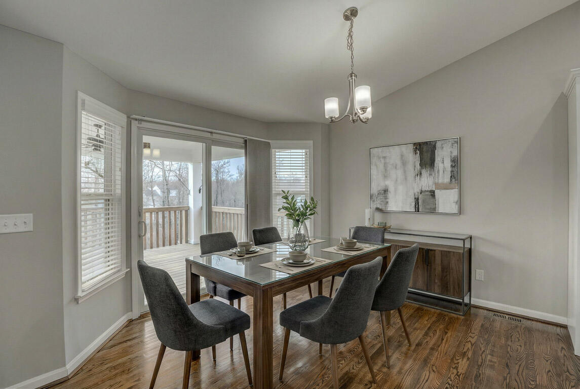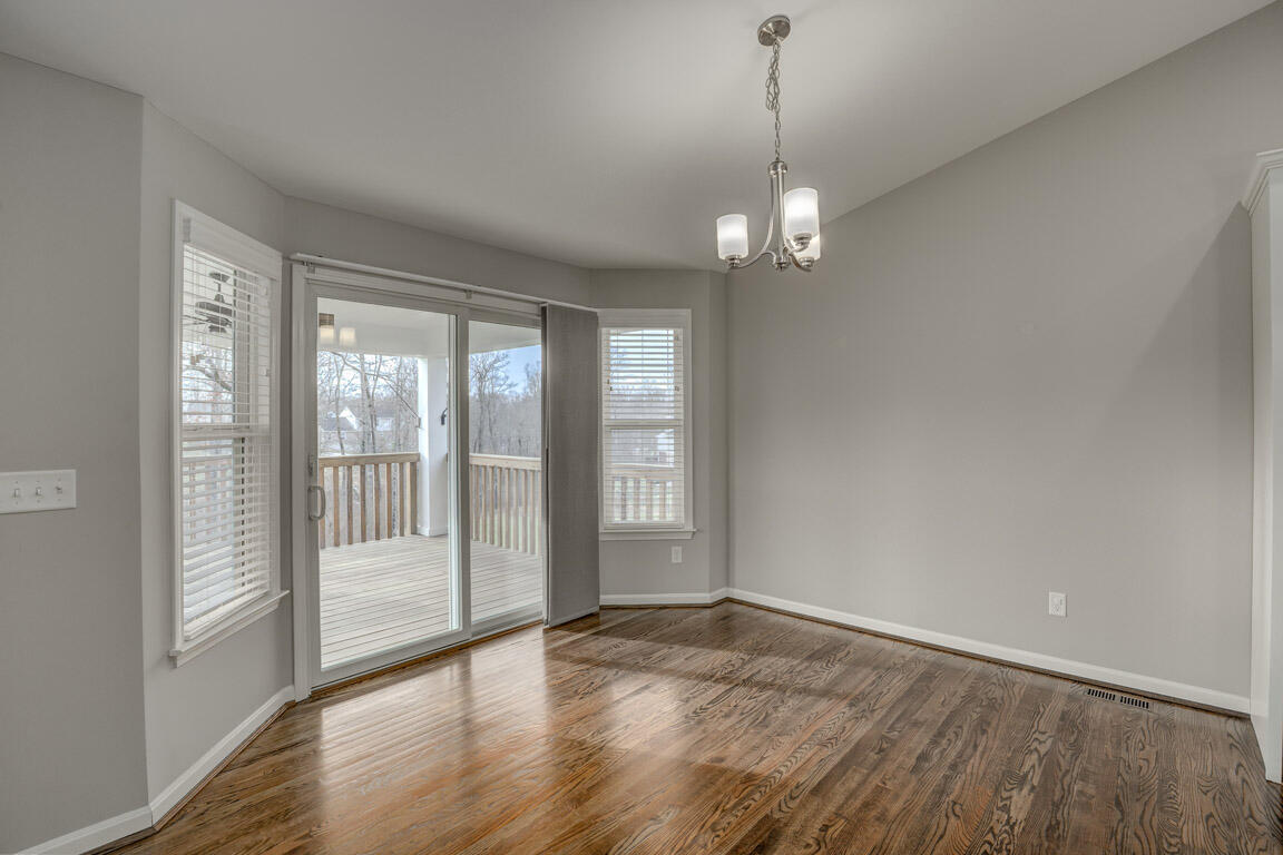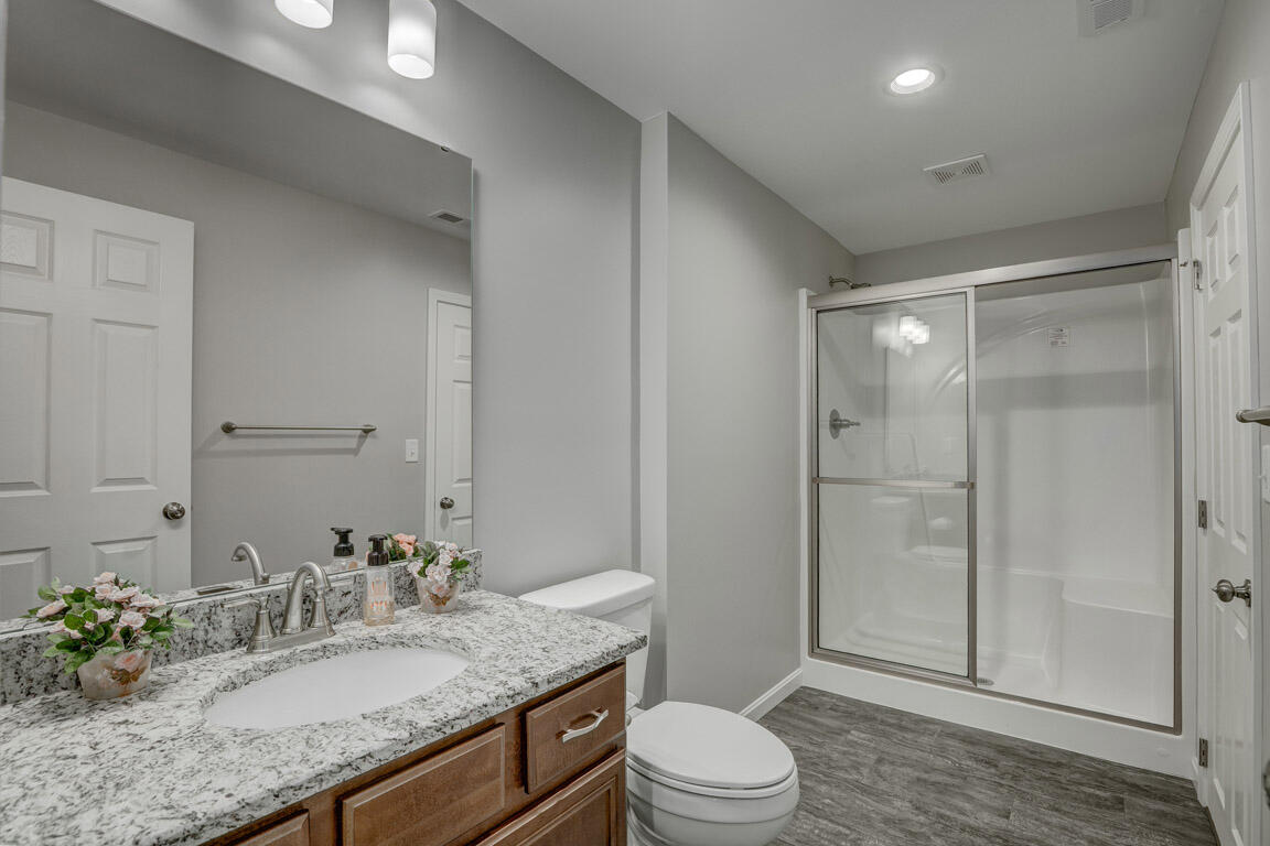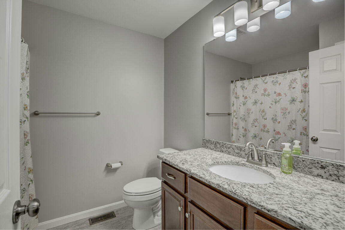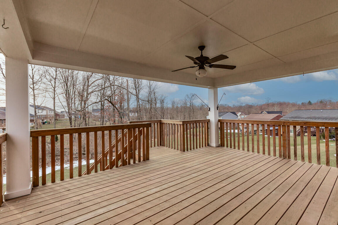 From the dining area, step out to the covered porch with ceiling fan and stairs leading to a flat backyard and enlarged patio below, perfect for entertaining. The spacious primary suite is a true retreat, featuring extra high ceilings, granite countertops, and a walk-in shower with bench. The finished lower level offers 9-foot ceilings, a walk-out, a large bedroom, and a full bath, ideal for guests or extended living.