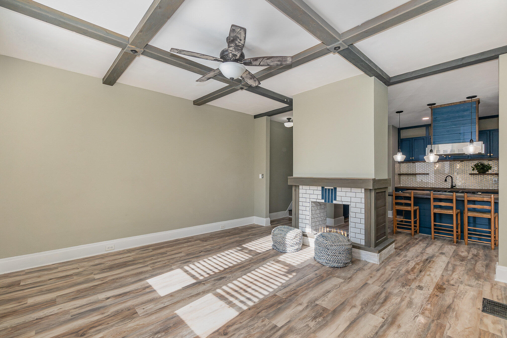 The home features a first-floor master suite with a full bath and laundry, plus three spacious bedrooms and another full bath upstairs. The kitchen has been started with stylish updates and opens into an inviting living area with beamed ceilings and a fireplace.