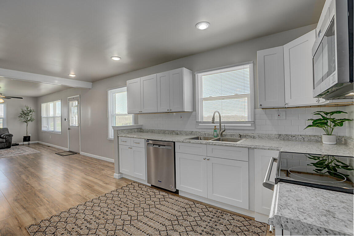 Enjoy peace of mind with a brand new metal roof, windows, HVAC, water heater, and drainage system. All-new flooring throughout, a beautifully redesigned kitchen featuring new cabinetry, tile backsplash, stainless steel appliances, spacious pantry, and large pull-out drawers for storage. The main-level bathroom has been refreshed with new tile a stylish vanity, wainscoting, and updated doors throughout the home.