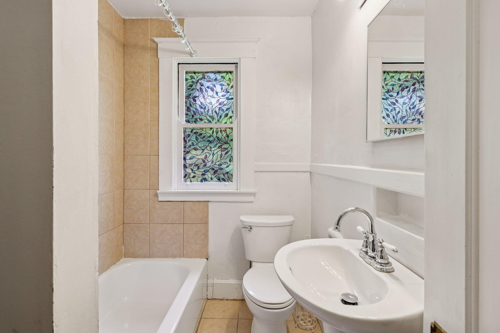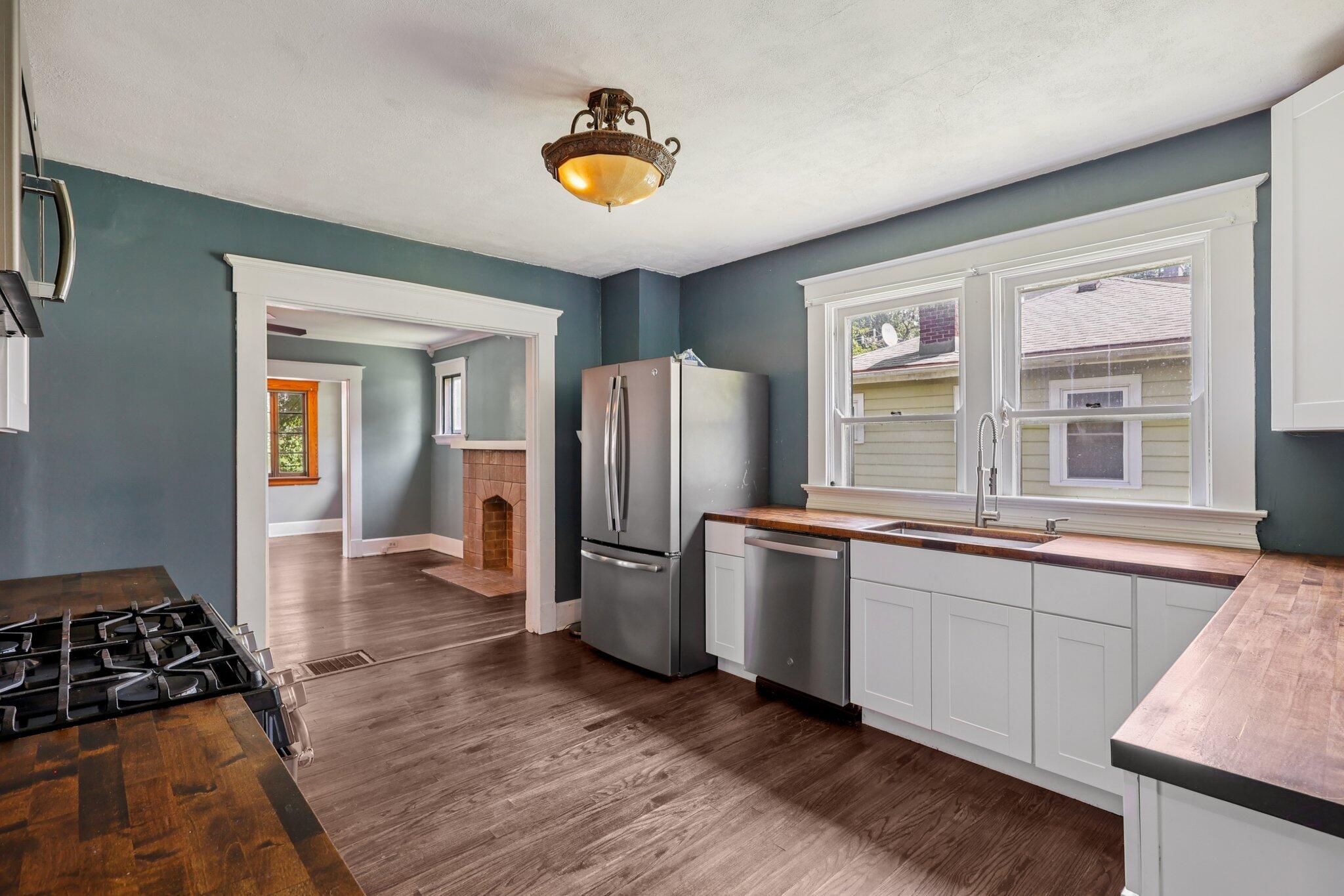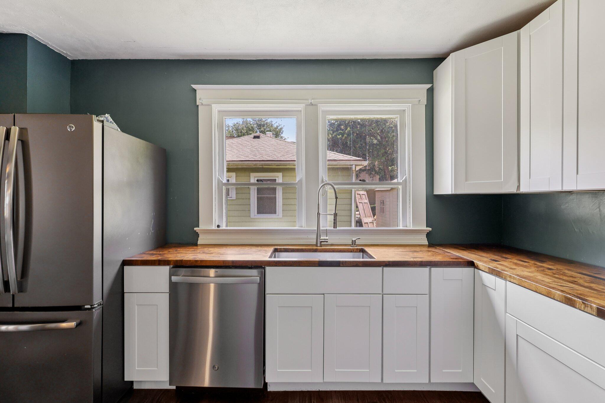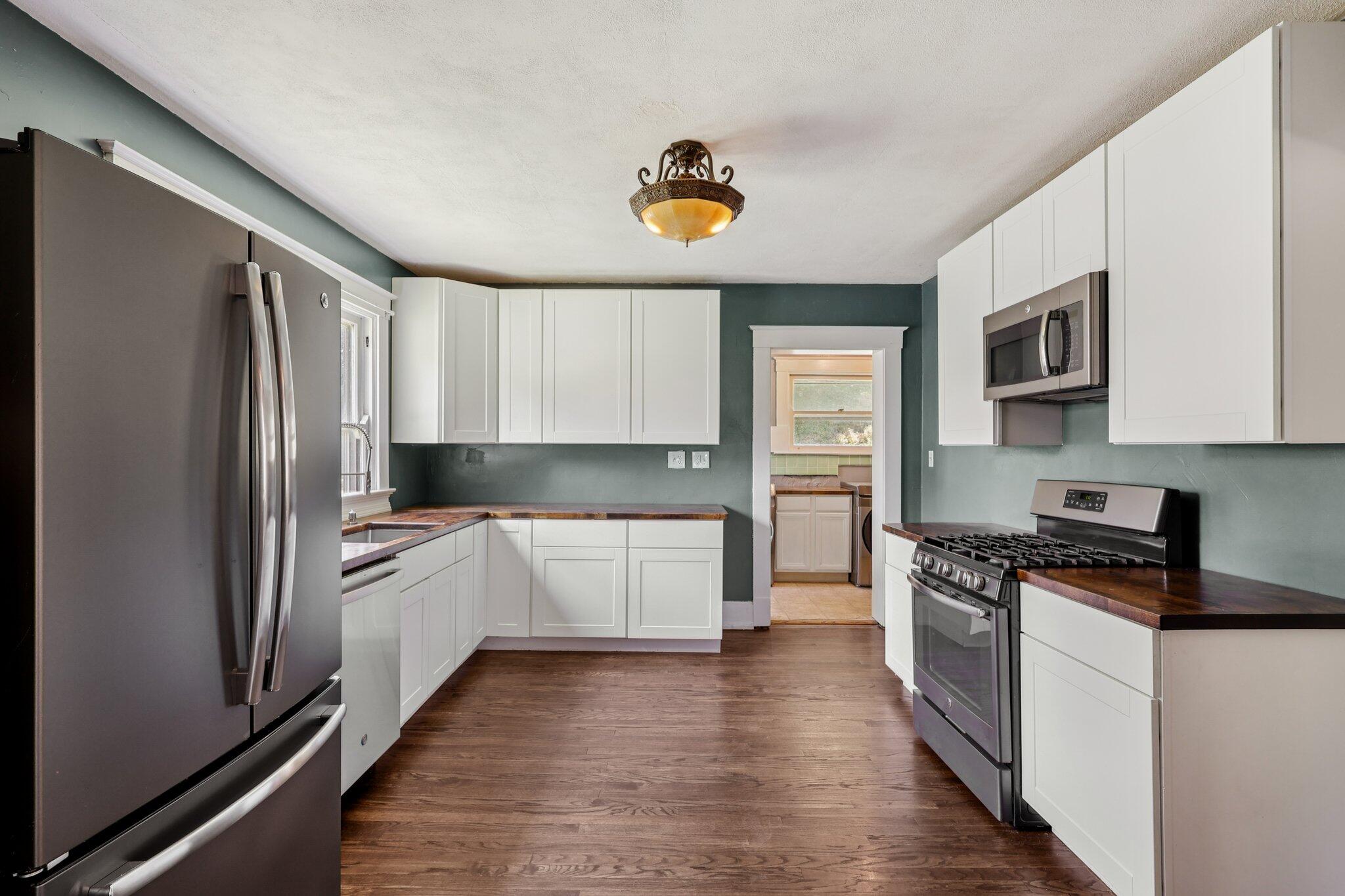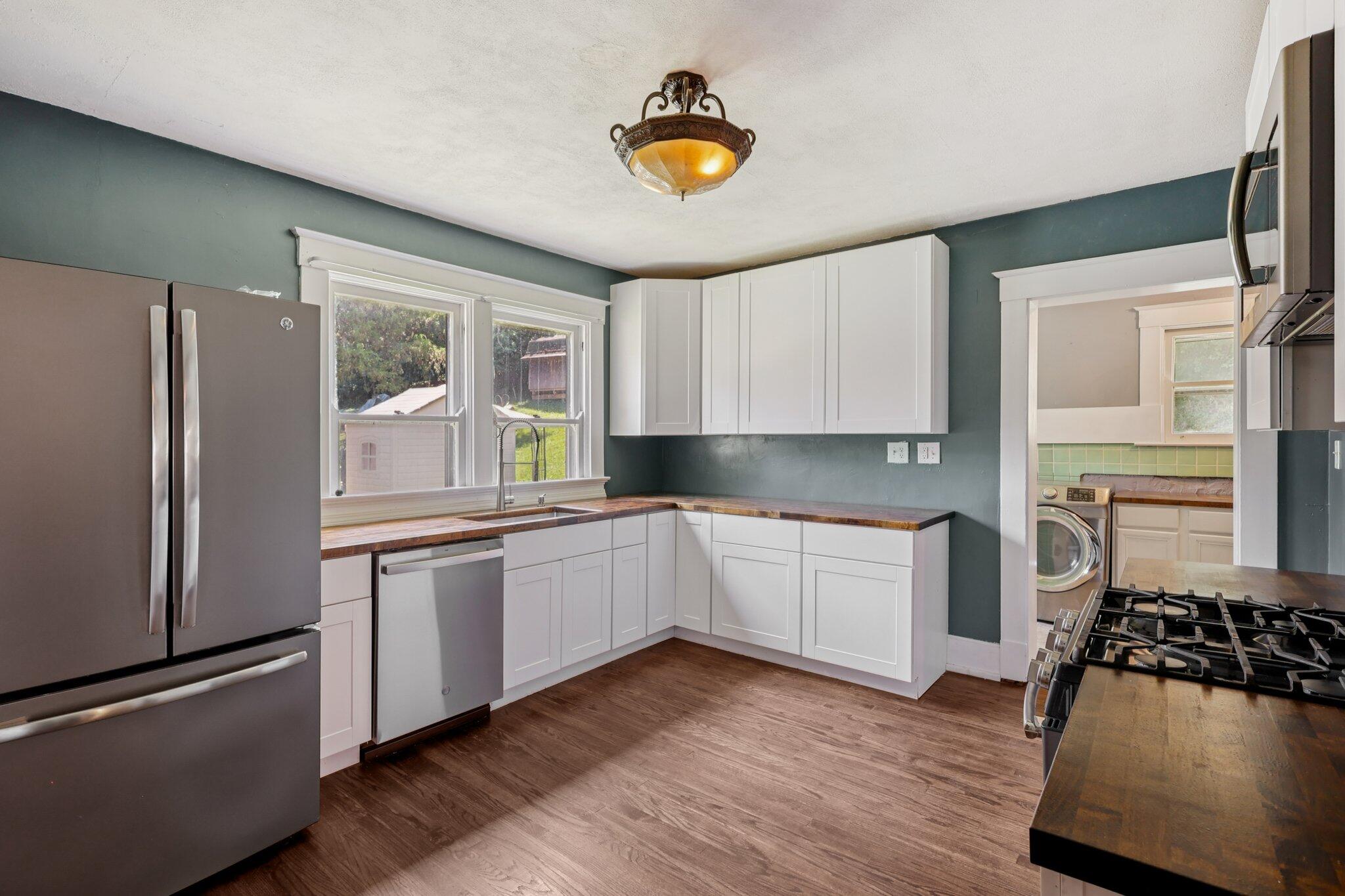Step into the updated kitchen, complete with butcher block countertops, sleek white cabinets, stainless steel appliances, a cooktop and oven, and a large undermount sink with pull-down faucet--perfect for the home chef. The laundry room includes a washer and dryer, along with ceramic tile flooring for easy maintenance.