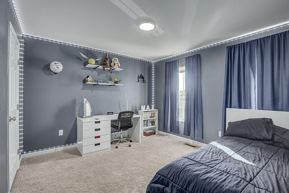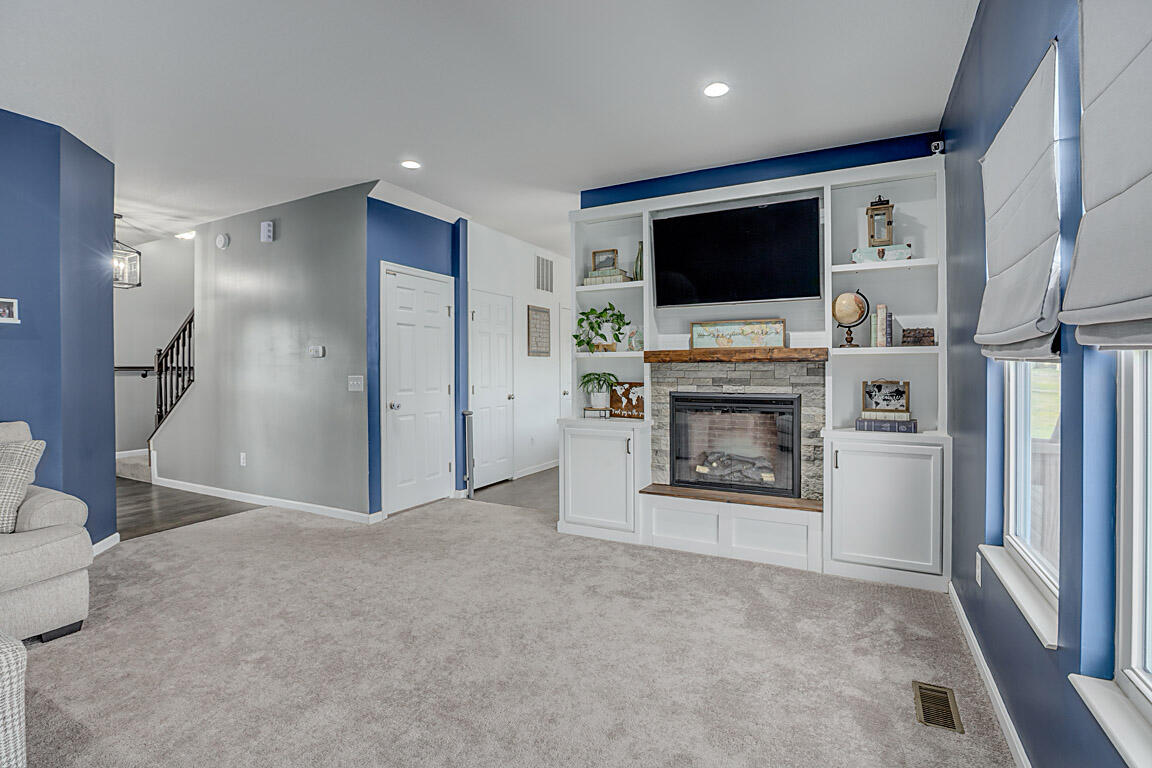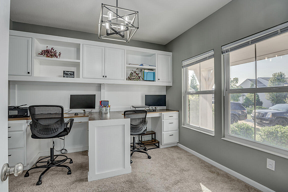 Inside, a custom‑built office w/ dual desks and butcher‑block tops provides an inspiring space for working from home. Down the hall, the sun‑lit living room features a custom fireplace, built‑in shelving & a perfect nook for your TV. An eye‑catching accent wall turns the dining area into a work of art.