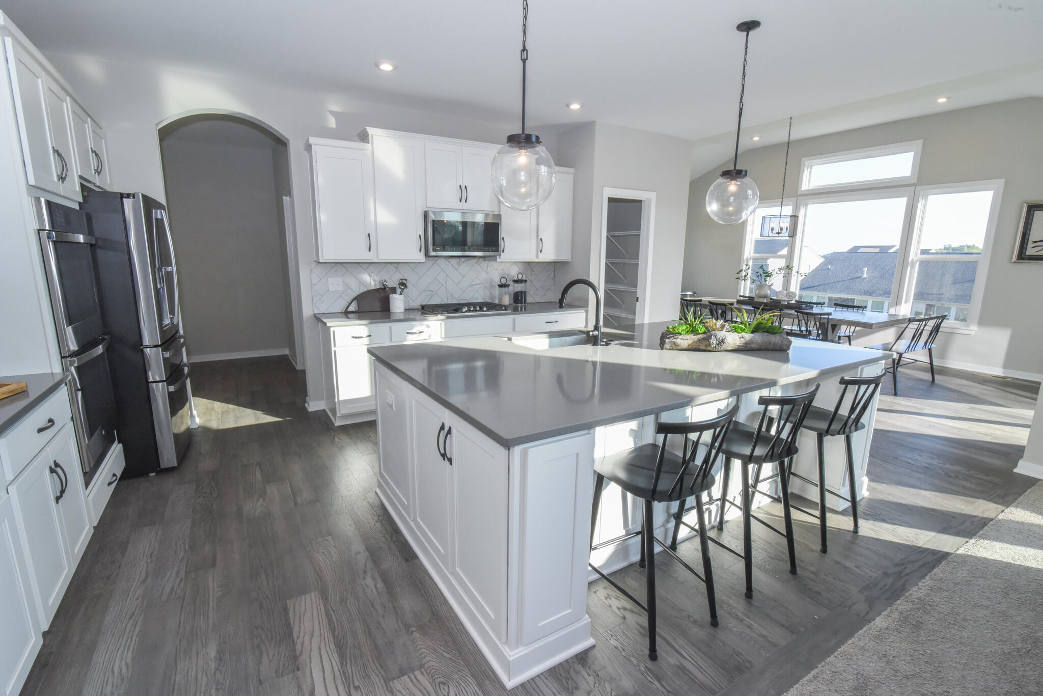Stunning Leland Western Craftsman plan by Fischer Homes in the beautiful community of Arcadia featuring a welcoming covered front porch. Once inside you'll find a private 1st floor study with french doors. Open concept layout with an island kitchen with built-in stainless steel appliances, upgraded multi-height cabinetry with soft close doors and drawers, upgraded quartz counter tops, HUGE walk-in pantry and morning room great for gatherings and all open to the family room with gas fireplace with stone surround.