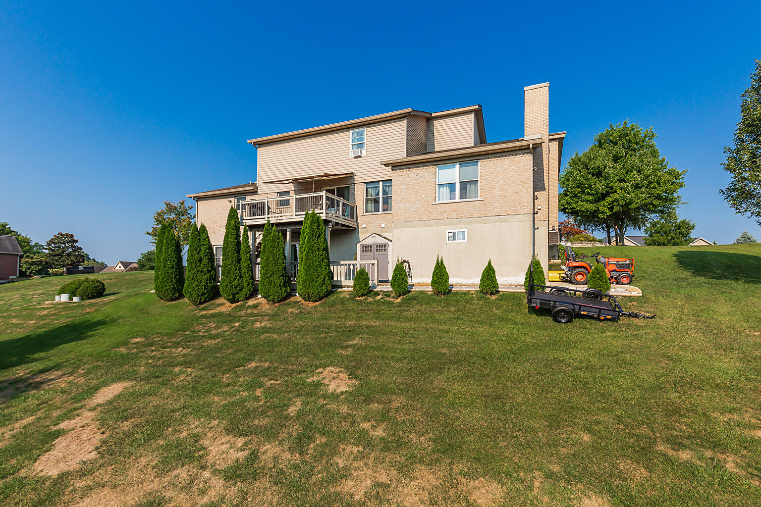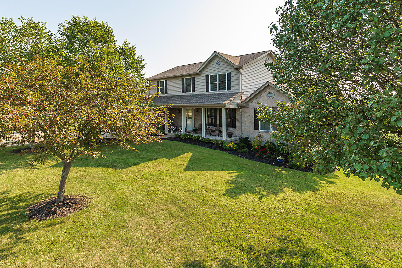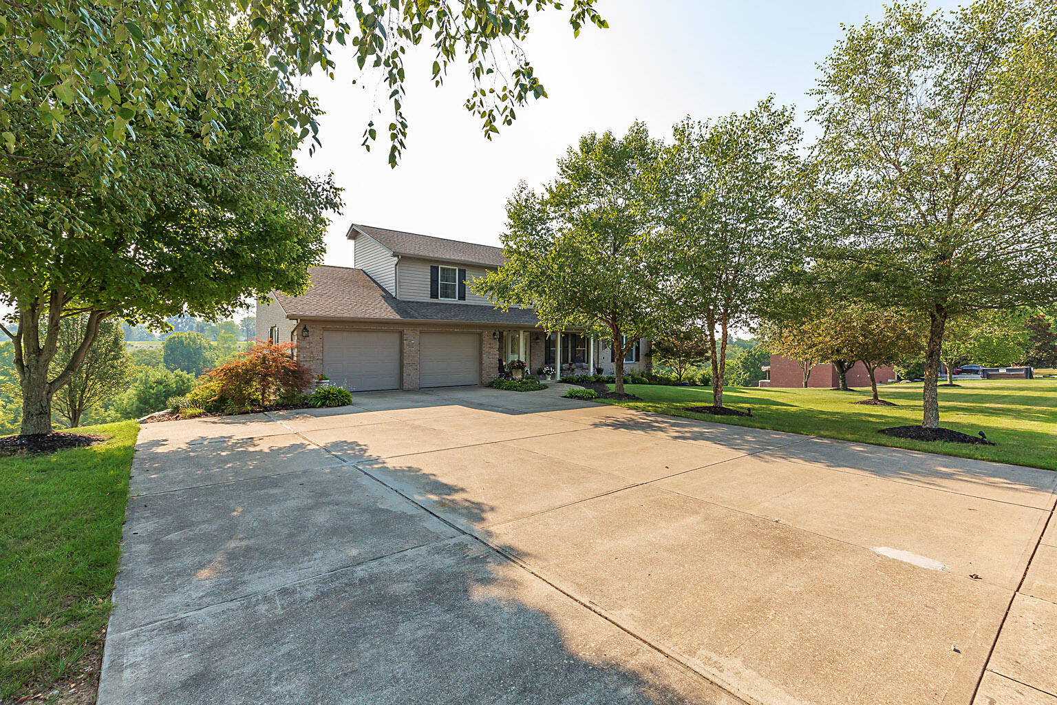 Discover unparalleled comfort and luxury in this custom-built home in the coveted Shaw Hill Subdivision. Perfectly designed for multi-generational living, the home features two Master Suites--one conveniently located on the main floor and another on the upper level. This true 5 bedroom home is nestled on a small cul-de-sac street on sprawling 1.6-acre lot, this residence offers the ideal blend of seclusion and convenience. The main level exudes elegance with its beautiful hardwood floors and an updated kitchen that boasts granite countertops, stainless steel appliances, and a seamless flow into the breakfast room and family room, complete with a cozy wood-burning fireplace. NO STEP living is possible on main level. The versatile formal living room can easily transform into a dining area or a home office. Enjoy breathtaking countryside views from the deck, where a power awning provides shade for your outdoor relaxation. Perfect home for entertaining! The expansive lower level is designed for both leisure and functionality, featuring a generous rec room with a gas fireplace and walkout access. Meticulously maintained and too many upgrades to mention! This one is a must see!