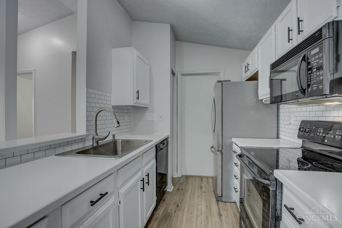 Just what you have been waiting for. This third floor condo has cathedral ceilings, freshly painted, new flooring throughout, new solid surface countertops in kitchen along with new sink, faucets, pulls. Both bathrooms have been updated with glass shower doors, tile. New vanity in hall bath and refinished vanity top in owners suite. There is a nice storage room on the same floor. All appliances remain including washer and dryer. Easy access to freeways, shopping and restaurants.
