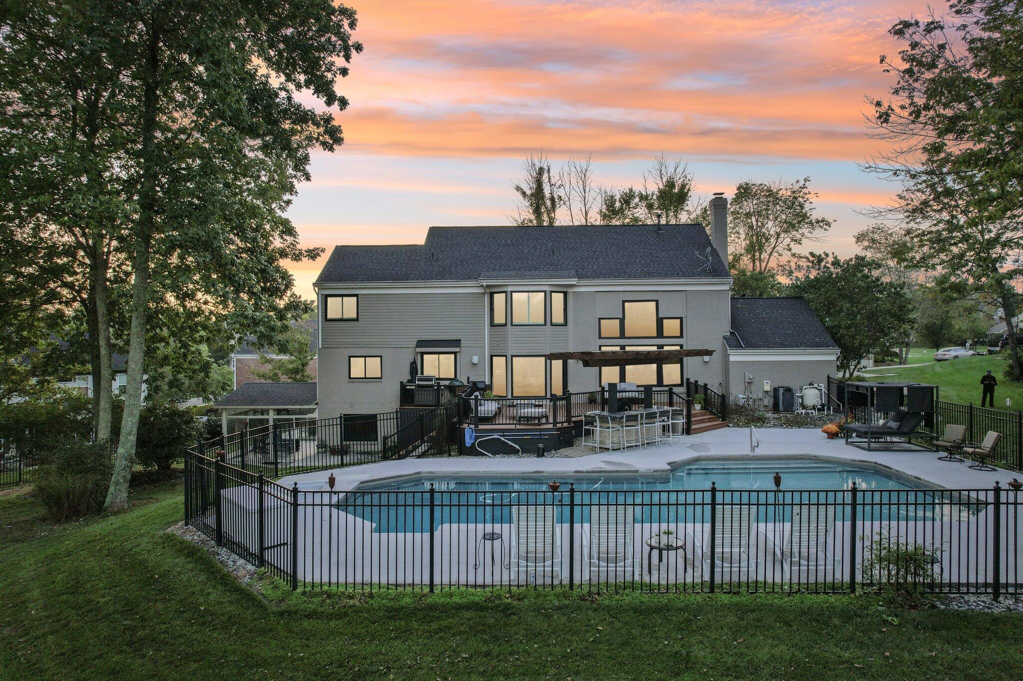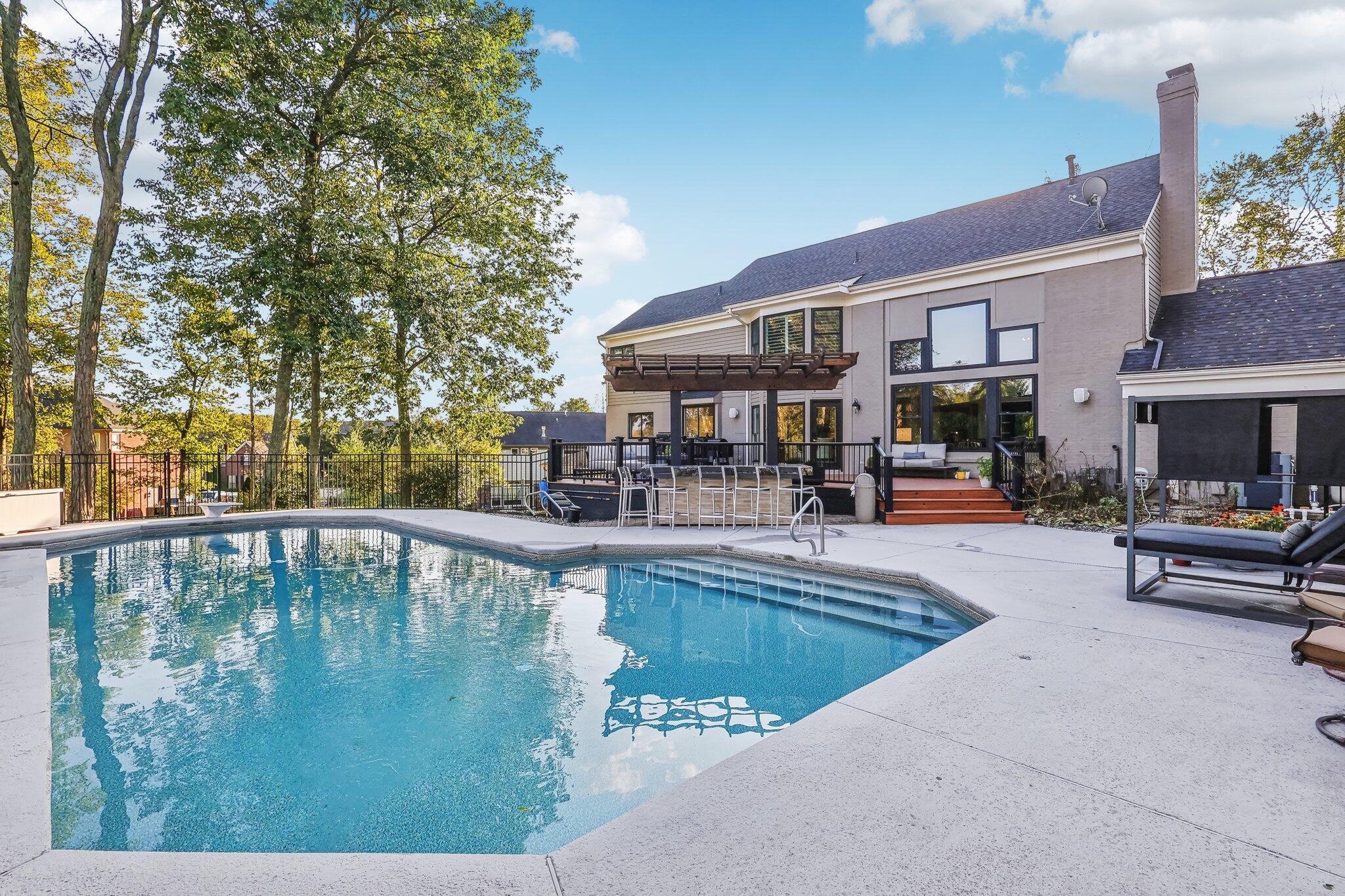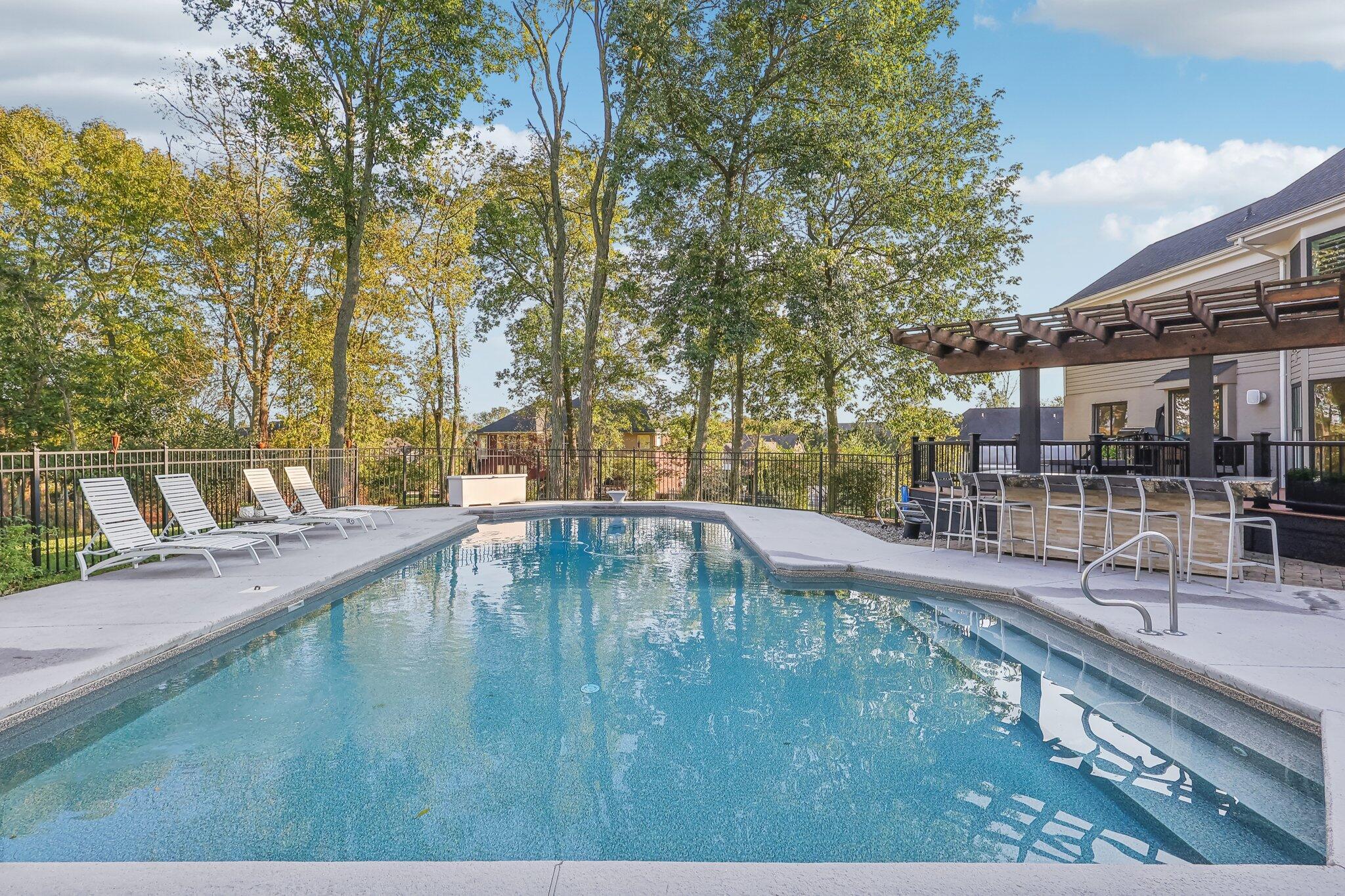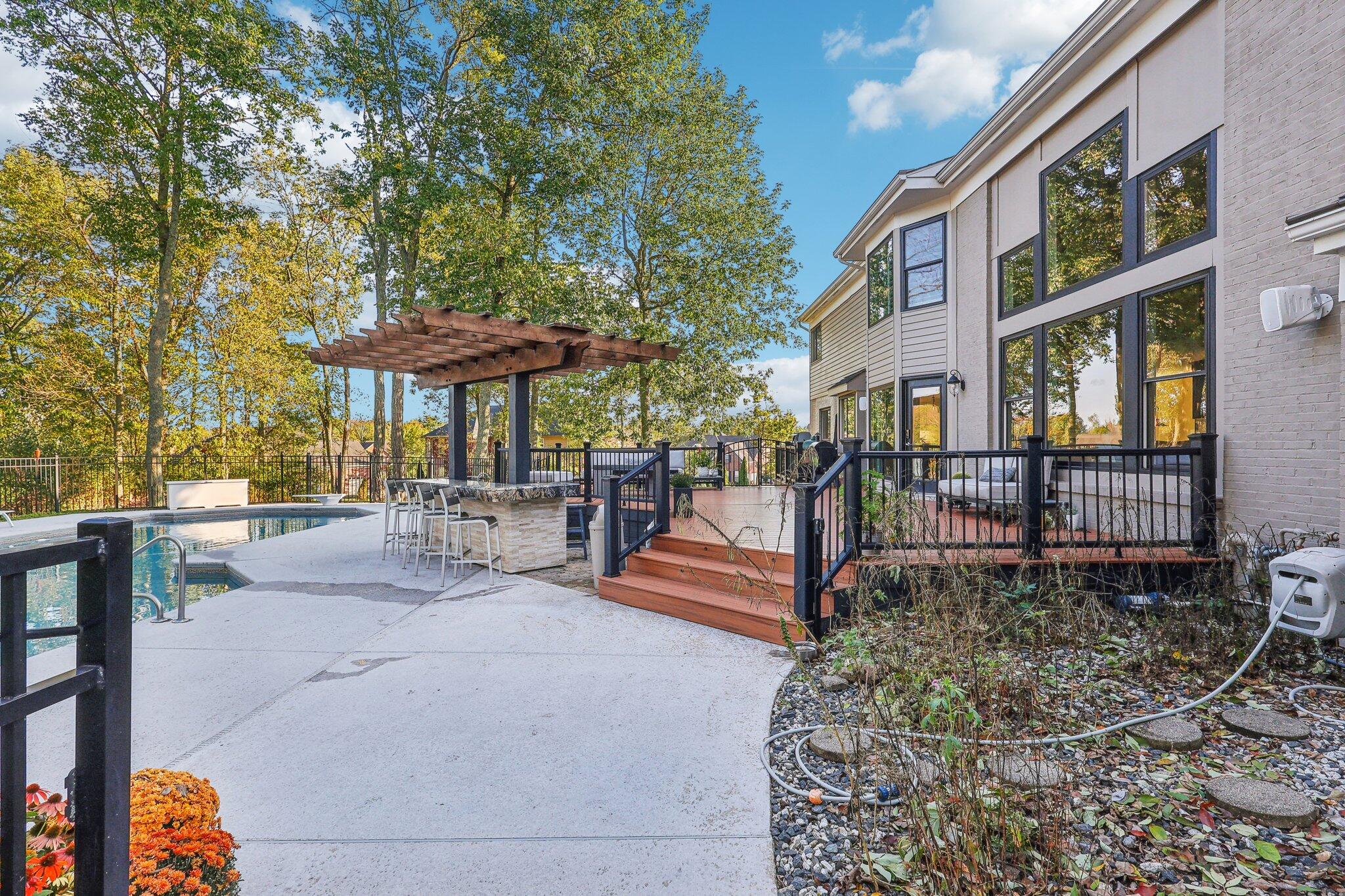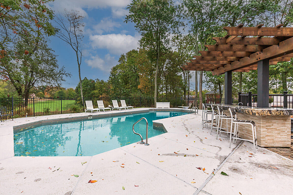 The impressive two-story great room opens seamlessly onto a composite deck, offering breathtaking views of your private outdoor oasis, complete with a custom bar and a heated inground pool. Venture to the side and find a serene solarium leading to a beautifully stamped concrete patio and a rejuvenating hot tub.