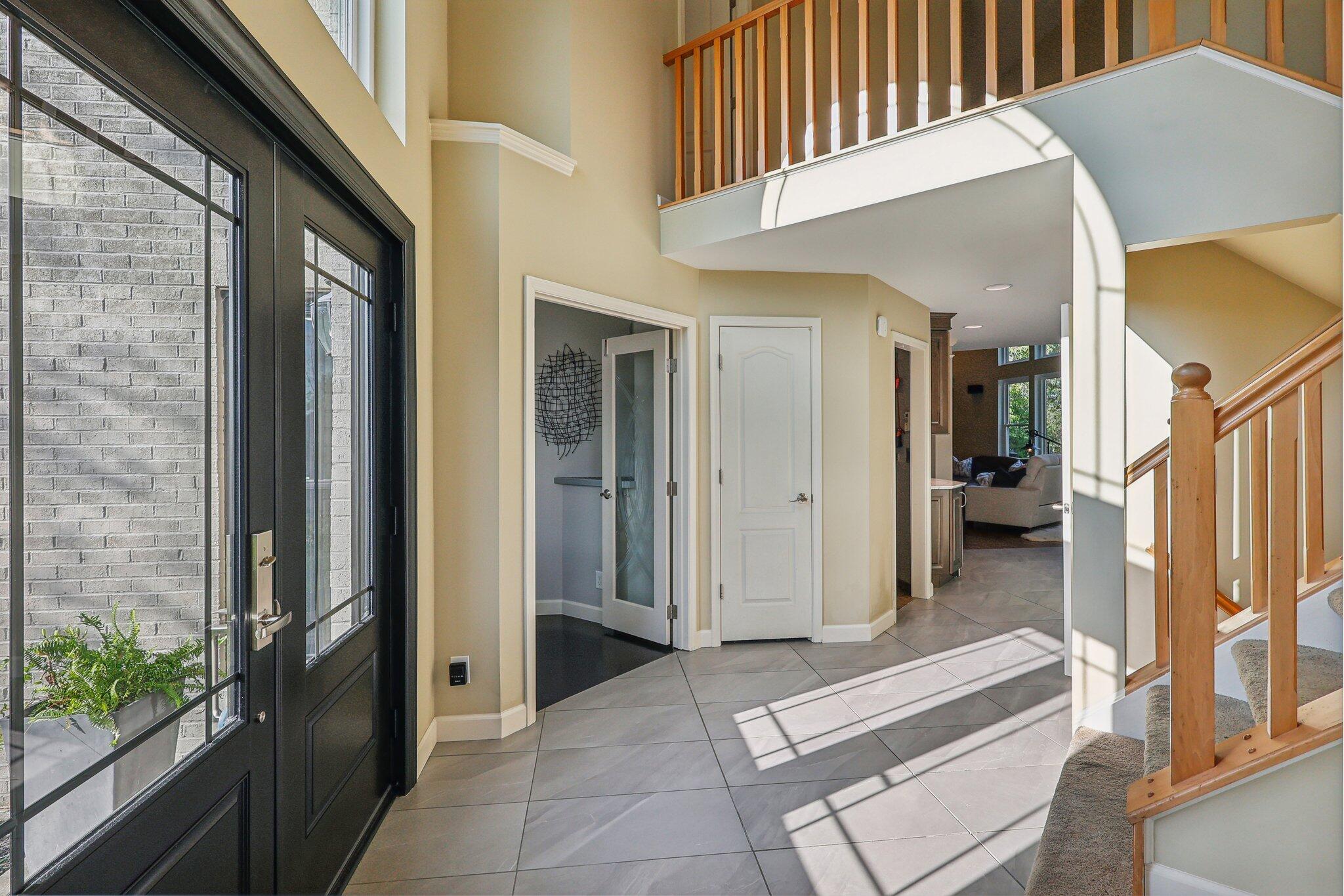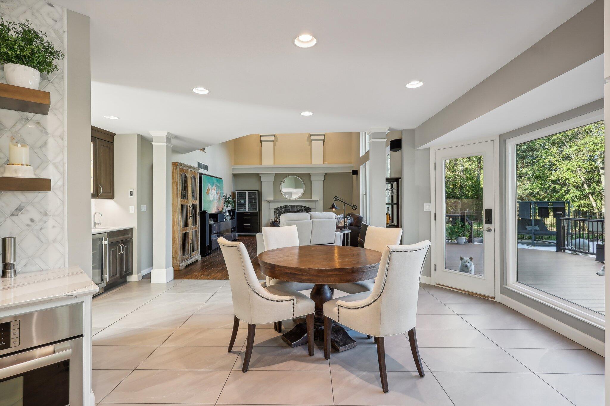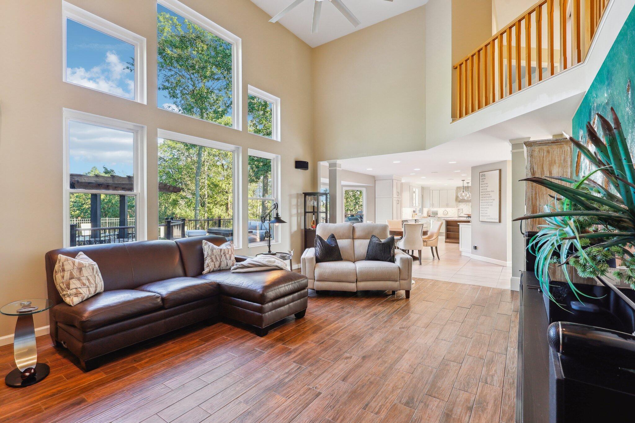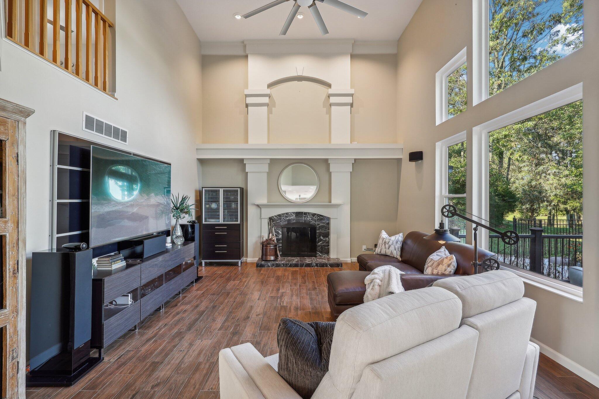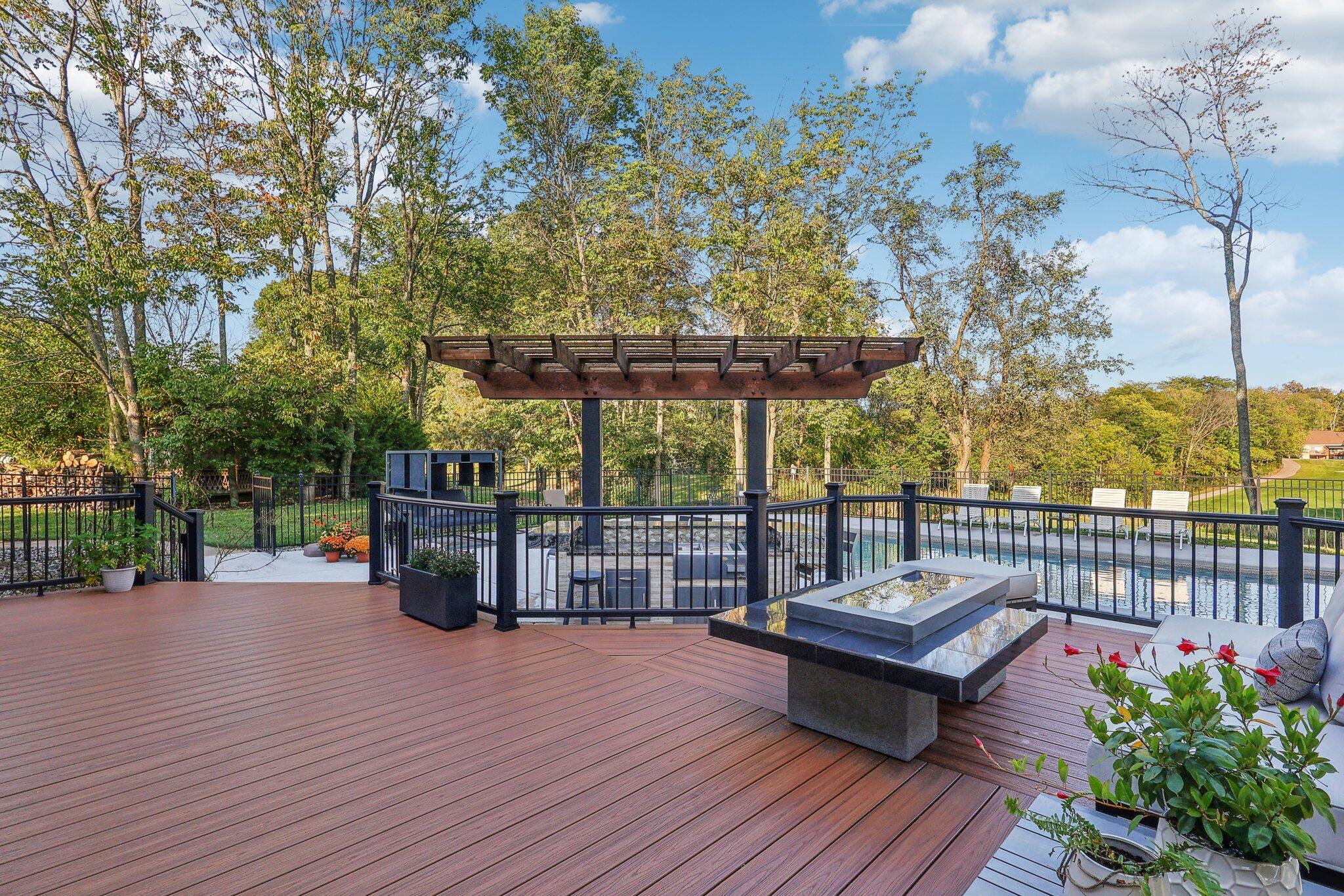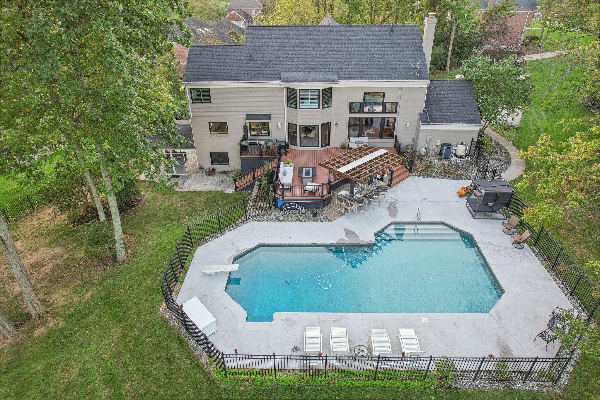 The impressive two-story great room opens seamlessly onto a composite deck, offering breathtaking views of your private outdoor oasis, complete with a custom bar and a heated inground pool. Venture to the side and find a serene solarium leading to a beautifully stamped concrete patio and a rejuvenating hot tub.