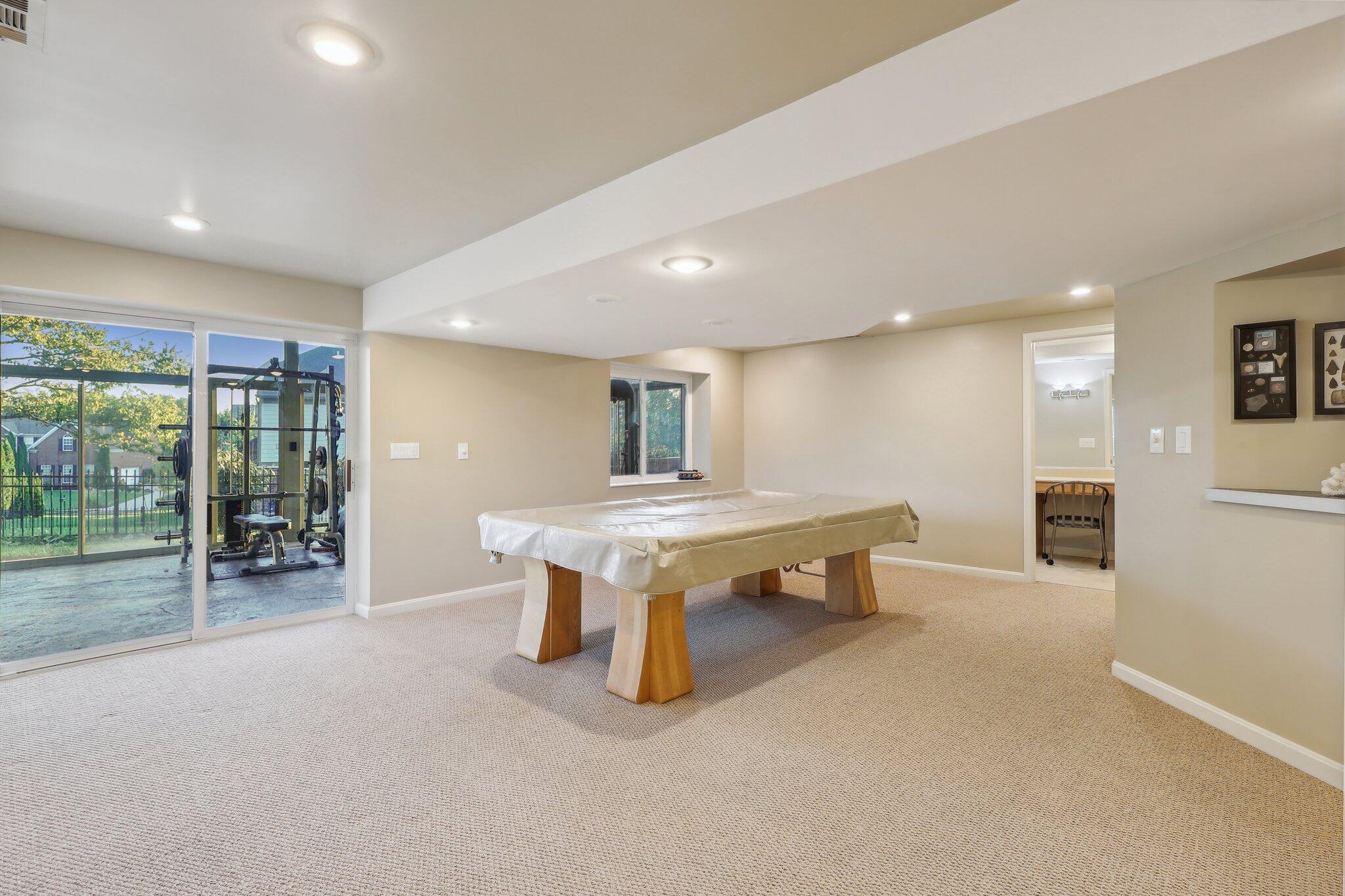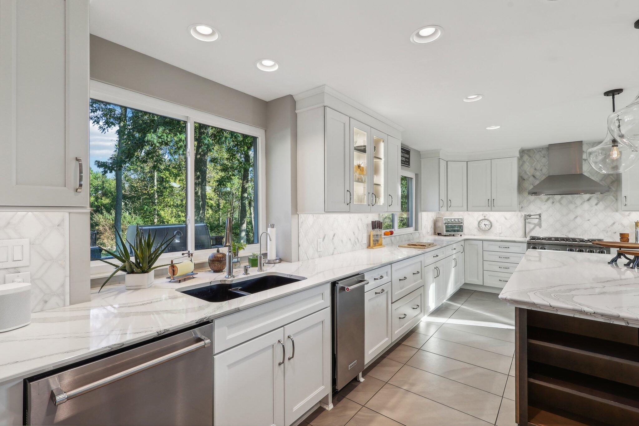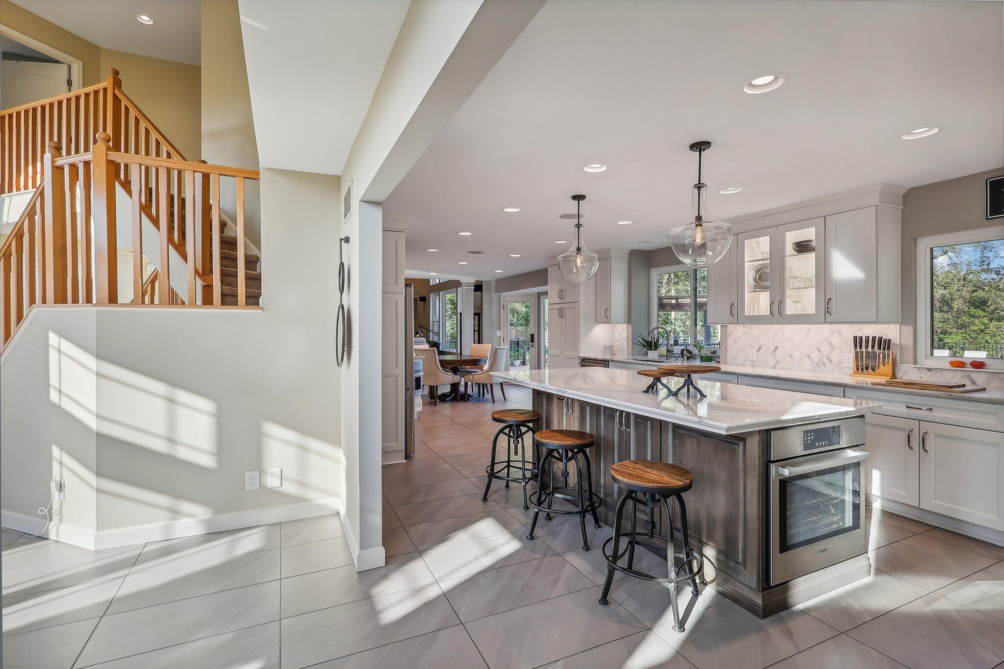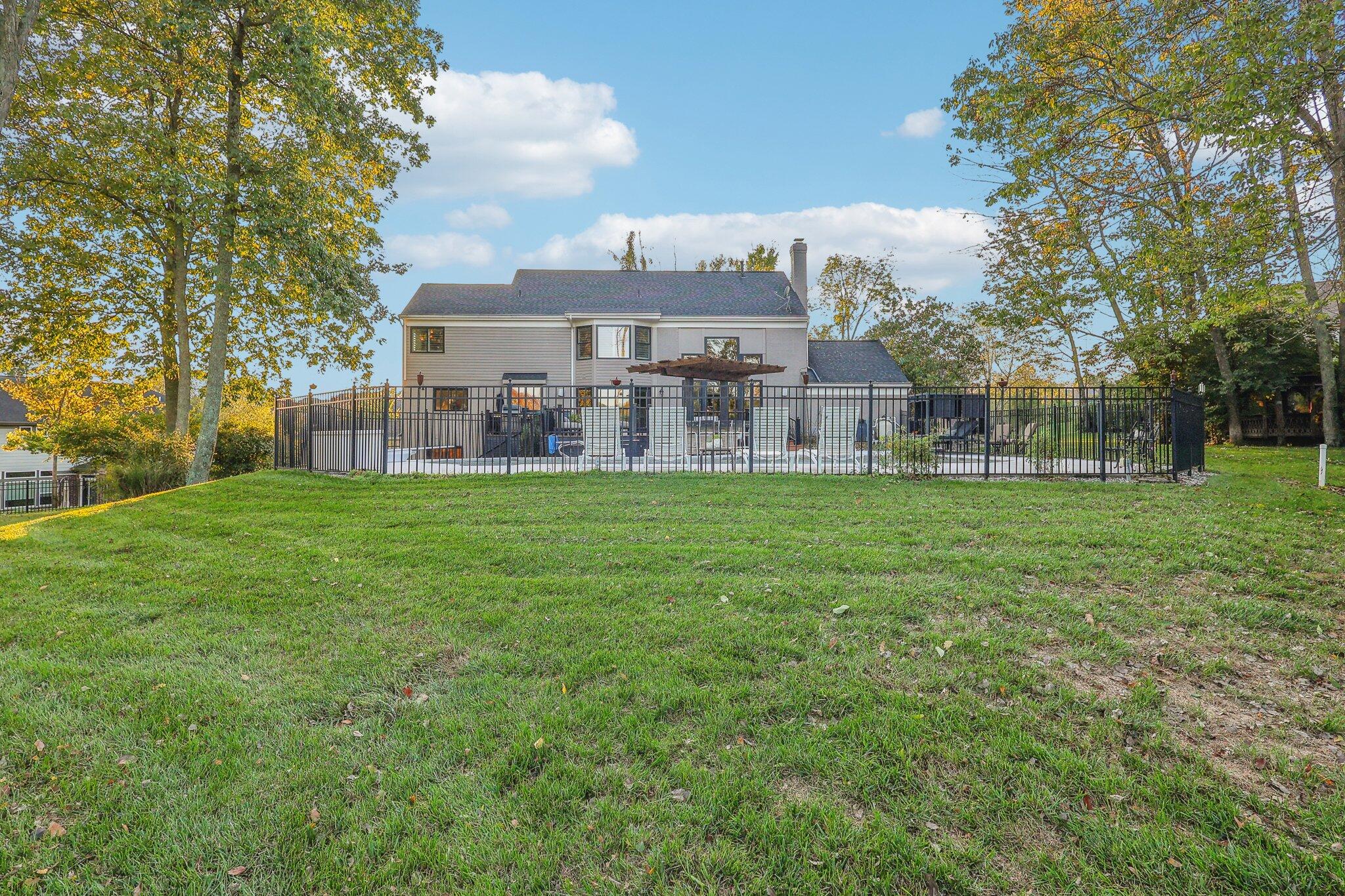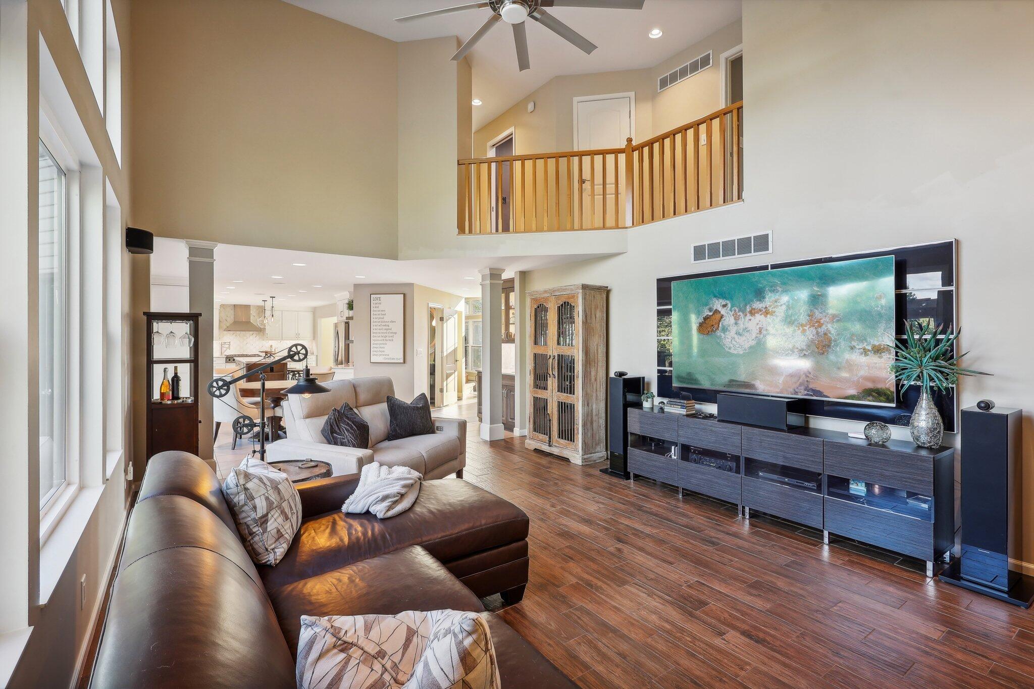 The impressive two-story great room opens seamlessly onto a composite deck, offering breathtaking views of your private outdoor oasis, complete with a custom bar and a heated inground pool. Venture to the side and find a serene solarium leading to a beautifully stamped concrete patio and a rejuvenating hot tub.