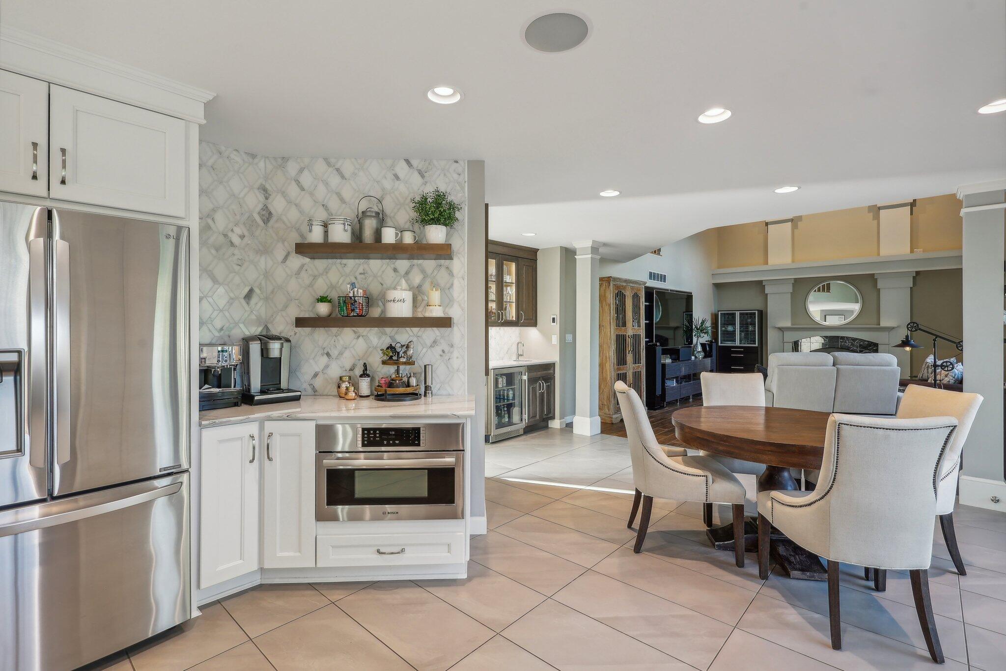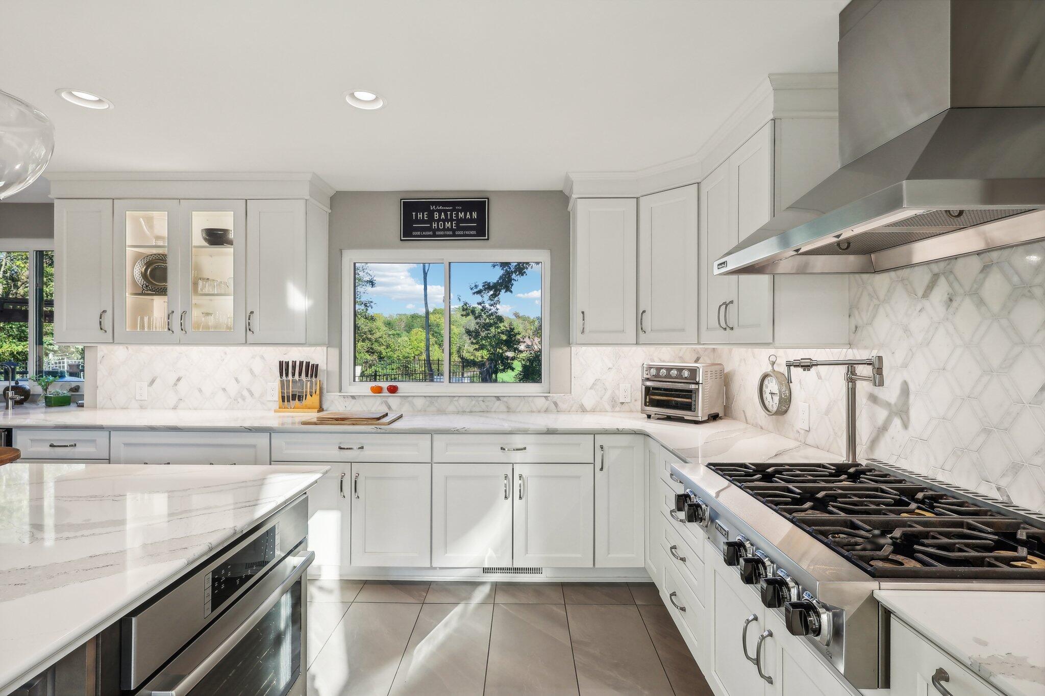 Step through the grand double doors into a magnificent two-story foyer that sets the tone for sophistication. The dining area and kitchen feature heated tile flooring, enhancing your comfort. The expansive kitchen is a culinary dream, showcasing a Viking cooktop, top-tier appliances, a built-in oven, and customized cabinetry with soft-close mechanisms and exquisite built-ins.